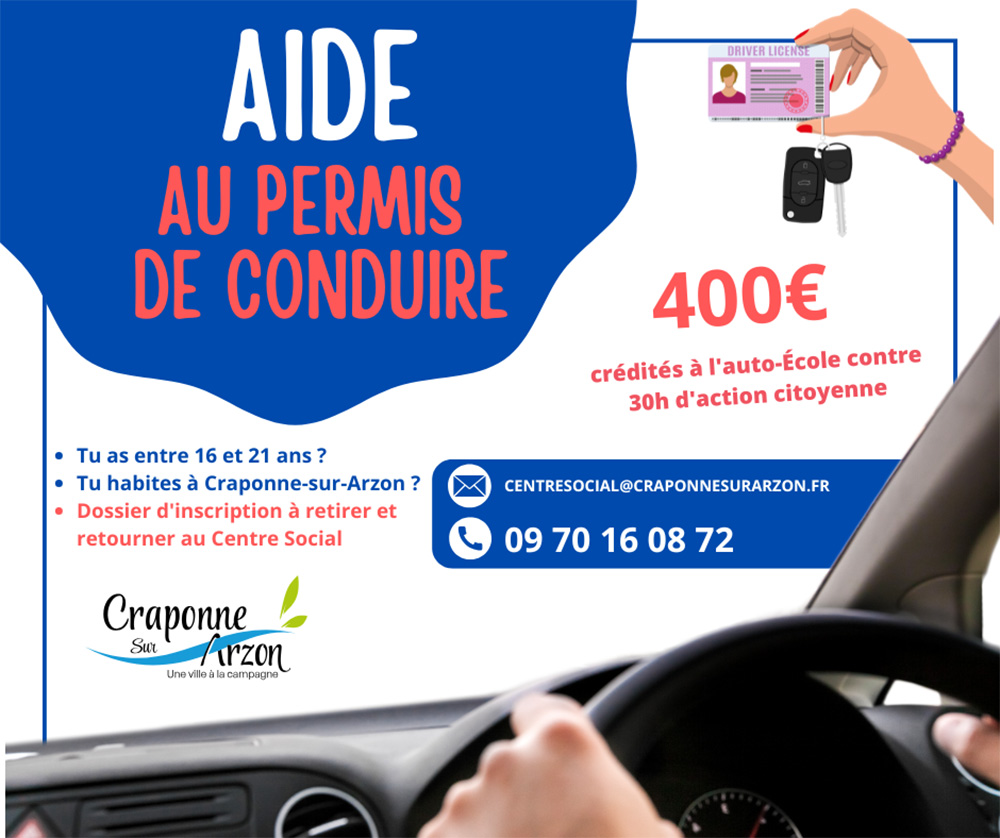 Le Centre social propose une aide au permis de conduire pour les jeunes habitant à Craponne-sur-Arzon (sous condition). Aussi, ceux souhaitant passer leur BAFA peuvent effectuer un stage rémunéré au centre social.